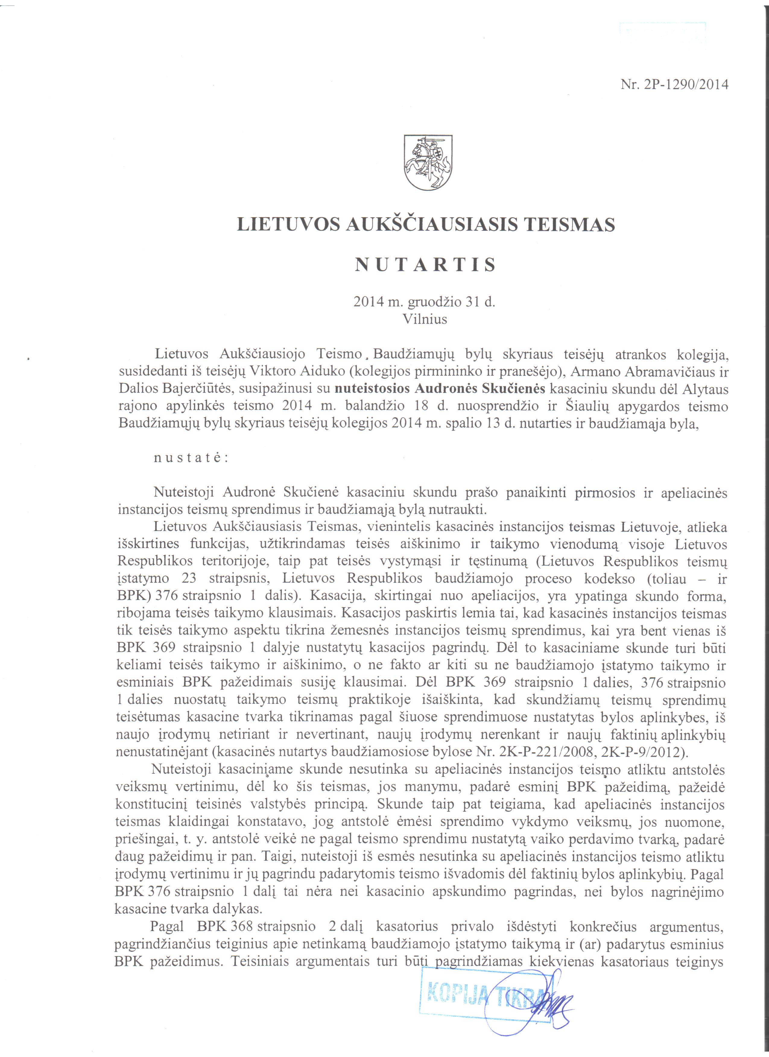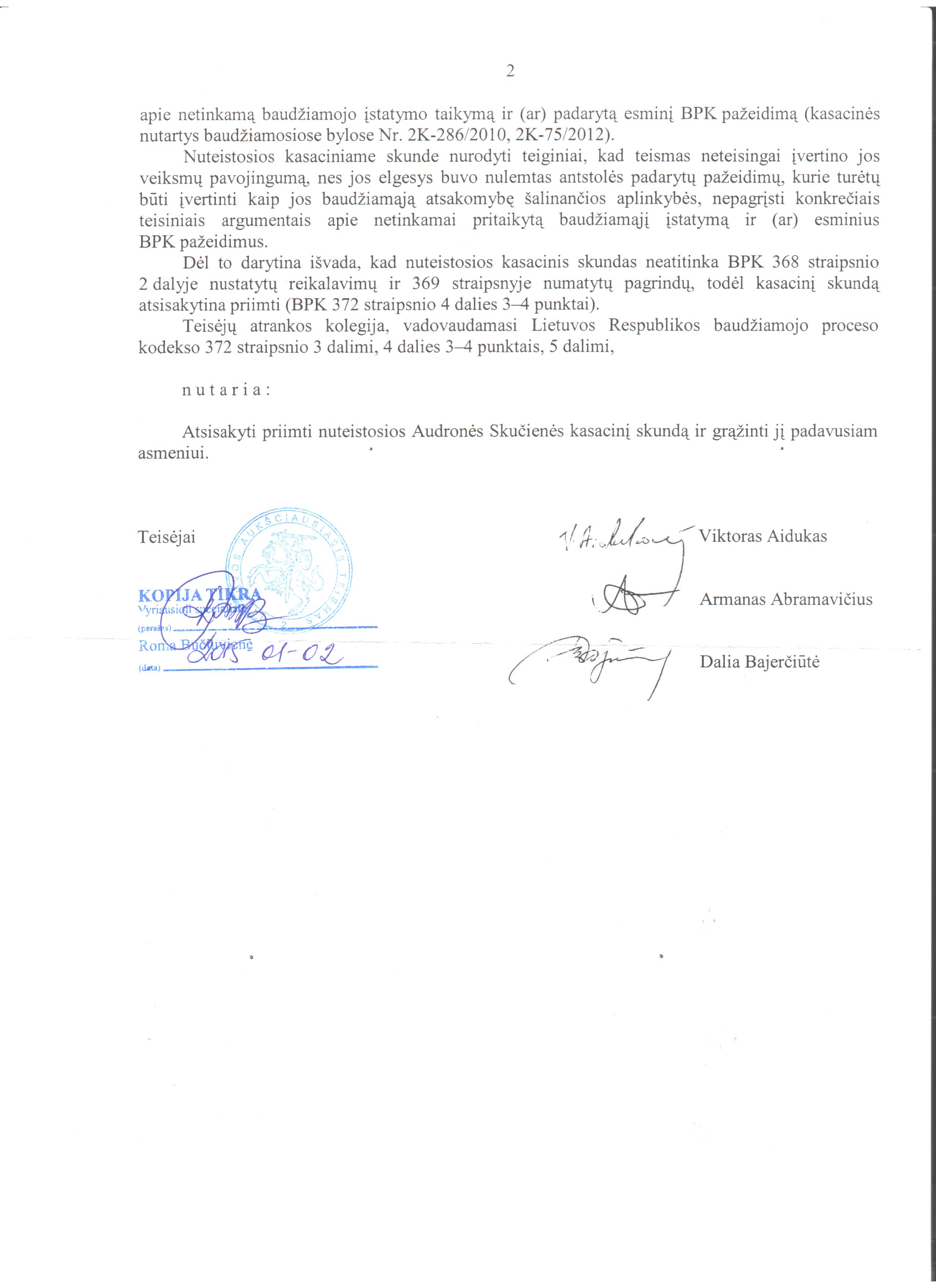 Kasacinį skundą Lietuvos Aukščiausiasis Teismas atmetė kaip neatitinkantį pagrindo. Į pateiktas aplinkybes gilinosi formalizuodami pagrindą kaip faktines aplinkybes, o ne kaip priežastį dėl skundžiamų teisės taikymo normų.