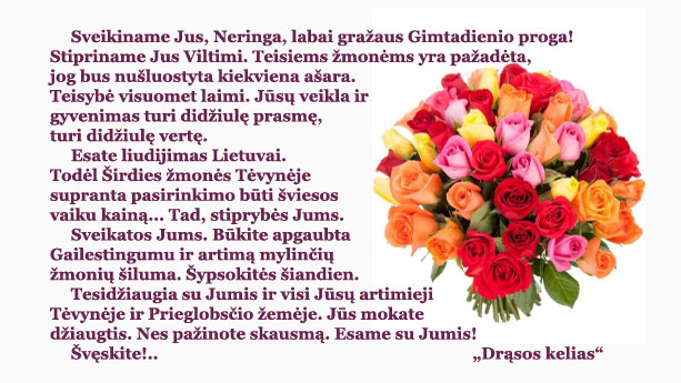 Sveikiname Jus, Neringa, labai gražaus Gimtadienio proga! Stipriname Jus Viltimi. Teisiems žmonėms yra pažadėta, jog bus nušluostyta kiekviena ašara. Teisybė visuomet laimi.