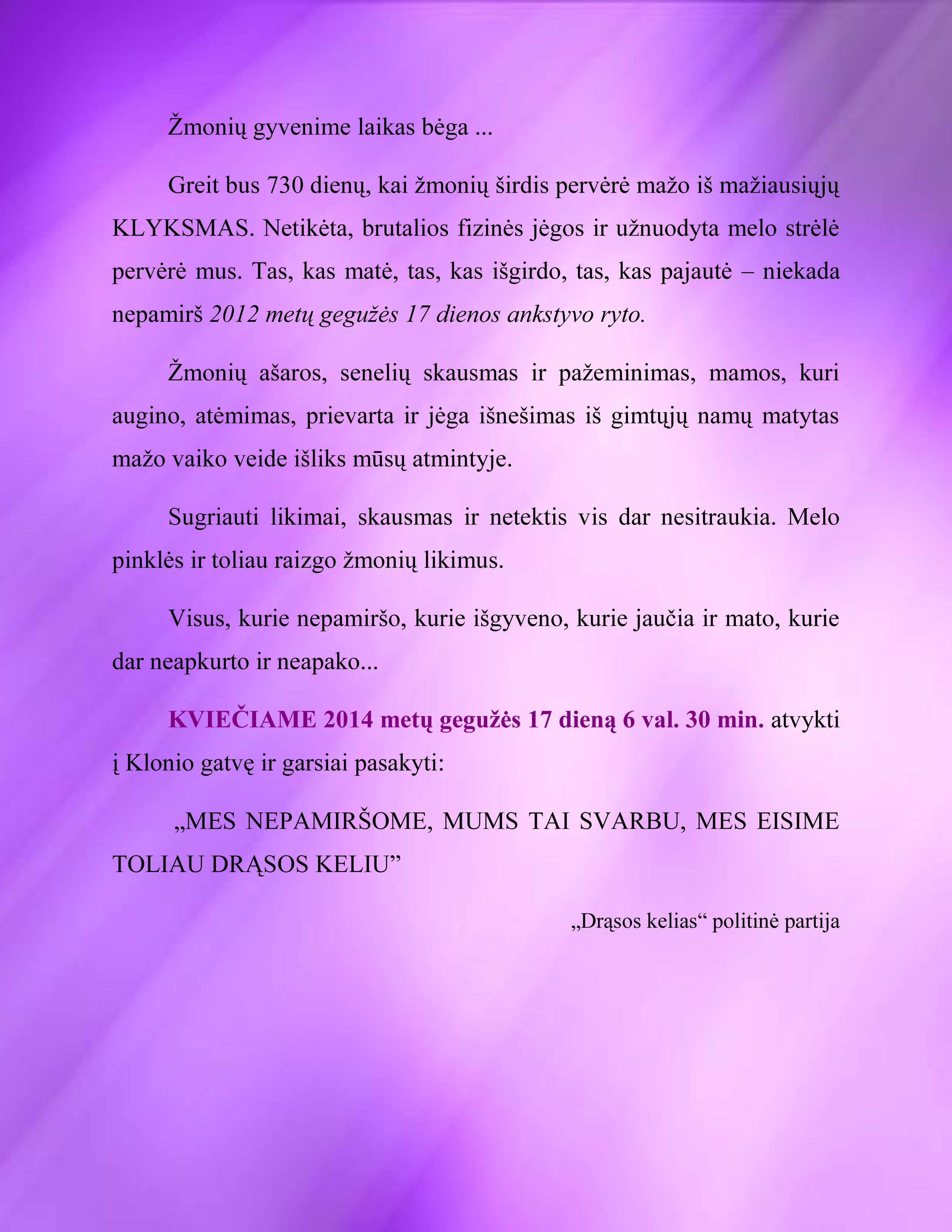 06:00-06:30 Garliava. Renkamės Klonio gatvės prieigose 06:30-08:00 Garliava. Gegužės 17-osios šturmo 2-jų metų minėjimas Klonio gatvėje.