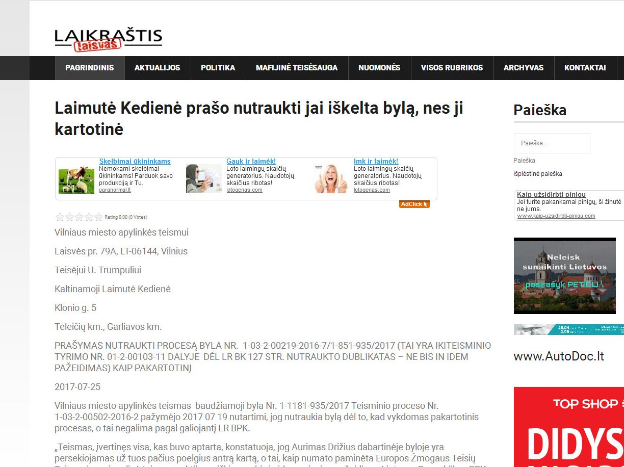 Jeigu teismui kyla abejonių, prašome išreikalauti Neringai Venckienei iškeltą bylą Nr. 01-2-00103-11 bei jos kardomosios priemonės – suėmimo bylą (teisminio numerio nežinau, bet liteko sistemoje tikrai galima atrasti), ten juodu ant balto minima netgi su ta pačia sakinių struktūra, LR BK 127 str. veika, kurioje kaip pakartotiniame procese esu teisiama, – nors nutartis dėl suėmimo ir dėl to paties LR BK 127 str. mano dukrai irgi egzistuoja, ir nėra panaikinta, ir netgi išversta į visas pasaulio kalbas, perduota Interpolui. Pridedu ir 2014 10 14 nepilnamečio apklausos protokolą, iš kurio aišku, jog esu persekiojama dėl to, kad mano anūkė Deimantė Kedytė patyrė prievartą, ir ta byla nebuvo tinkamai ištirta – mergaitė apie svetimus vyrus motinos bute prisimena ir dabar, ir aš esu persekiojama kaip pedofilijos bylos nukentėjusiosios močiutė, bei tos bylos liudytoja. Nors per naujus pakartotinius bylų procesus bandoma pateikti, jog mergaitę neva tvirkinome mes ir dar intelektualiai (net tokios įstatyminės sampratos nėra.)