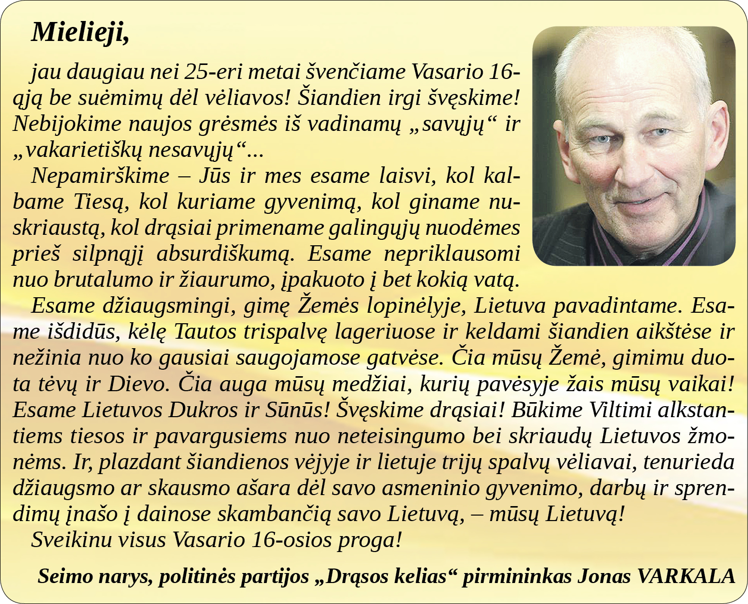 Vasario 16-osios – Lietuvos valstybės atkūrimo dienos proga sveikina Seimo narys, politinės partijos „Drąsos kelias” pirmininkas Jonas Varkala