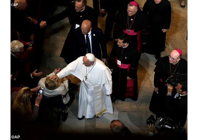 Popiežius Pranciškus sekmadienį, rugsėjo 27-ąją, paskutinę savo istorinio vizito Jungtinėse Valstijose dieną, susitiko su seksualinės prievartos aukomis, kurioms sakė, kad „Dievas verkia” dėl jų kančių, ir žadėjo, kad kaltieji bus patraukti atsakomybėn.